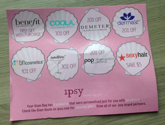 Each month comes with a card - but it's a little different than the typical subscription box card. Instead of describing the products in your bag, they have coupon codes and offers from all the brands you may receive in your Ipsy bag that month: