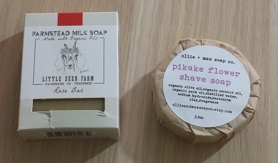 The Rose bar is infused with geranium and is supposed to be great for your face. It smells so great! The Pikake Flower soap also smells heavenly. Shave soaps are round so they will fit in the bottom of your shave mug and you can lather up your brush with them.