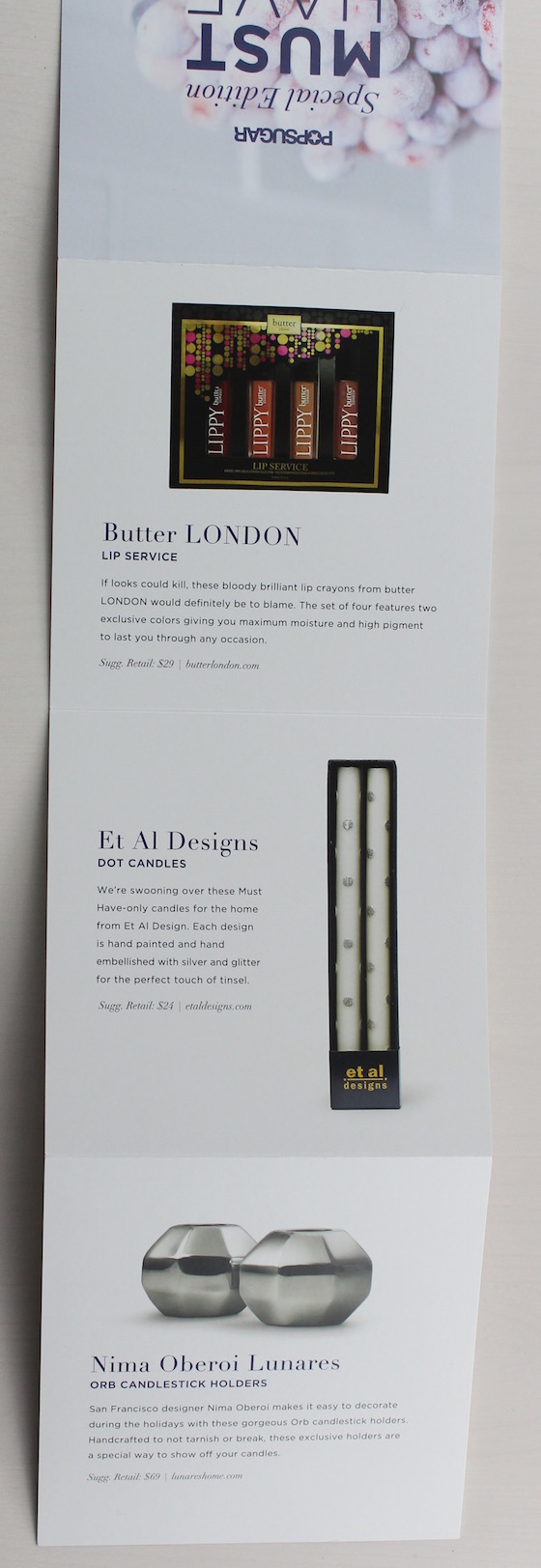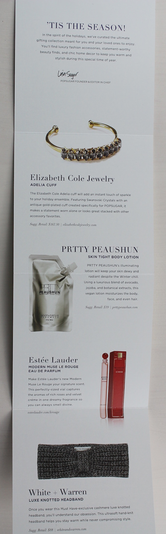 Verdict: This box has a value of about $422! I think that's great for a $100 box, and to me, 5 out of the 7 items are very giftable too. I love both the beauty items. I would say the Prtty Peaushun isn't as giftable as the lip glosses only because if your giftee doesn't know about the brand, it might just look like a strange foil pack of lotion! The bracelet and headband are both high-quality luxe fashion items, and the candlestick set is a great home item to keep or gift.