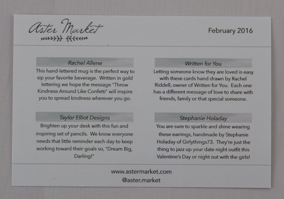 The Products: “Aster Market is a monthly delivered box of exceptionally made, small-batch products from around the world. An Aster Market box will include anything from home décor, jewelry, accessories, paper goods, bath products and more.”