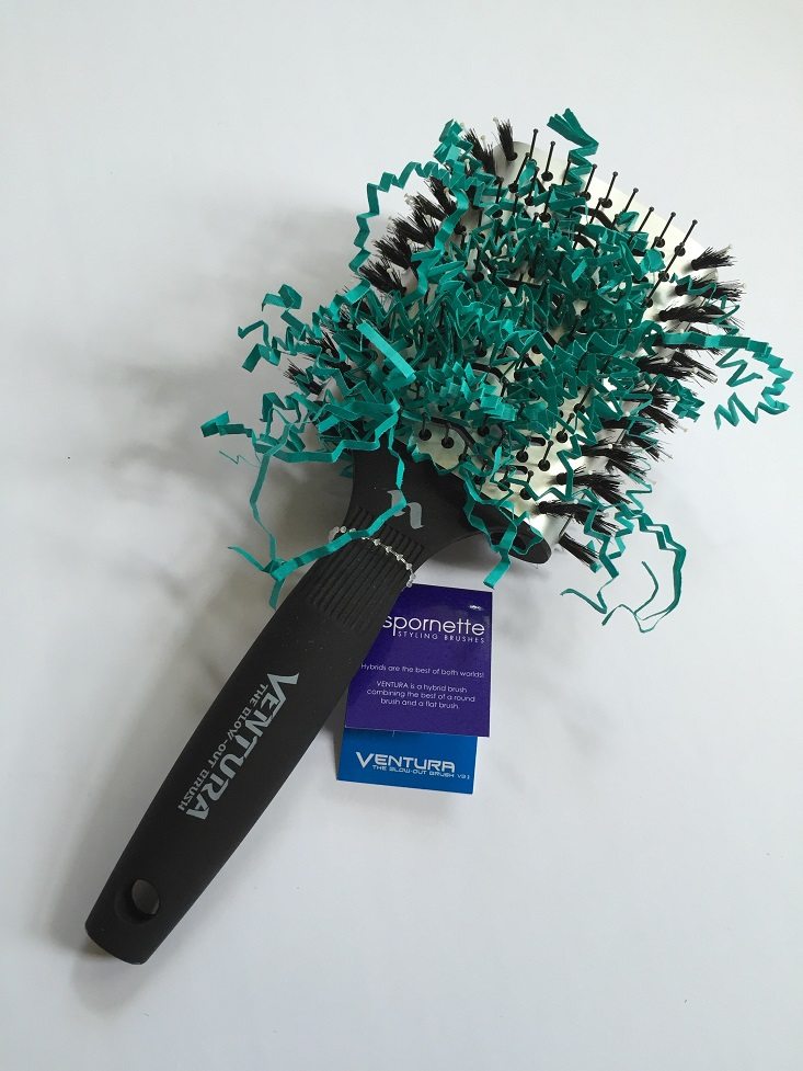 This hybrid brush (part paddle brush/ part round brush) is meant to help cut drying time considerably. All I got was a tangled mess when I tried to use this but I am an admitted hair spaz so I don’t blame the brush. I blame my lack of coordination and know-how. I thought it was so funny when I took it out of the box and it was filled with paper crinkles!