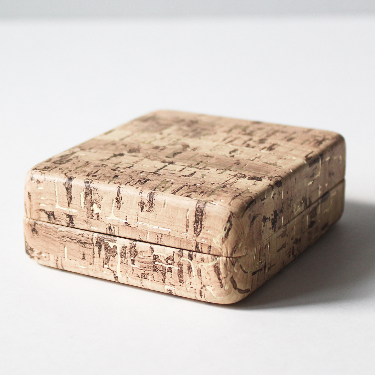 This pill box has gold flecks mixed into the cork and a peach felt lining inside: