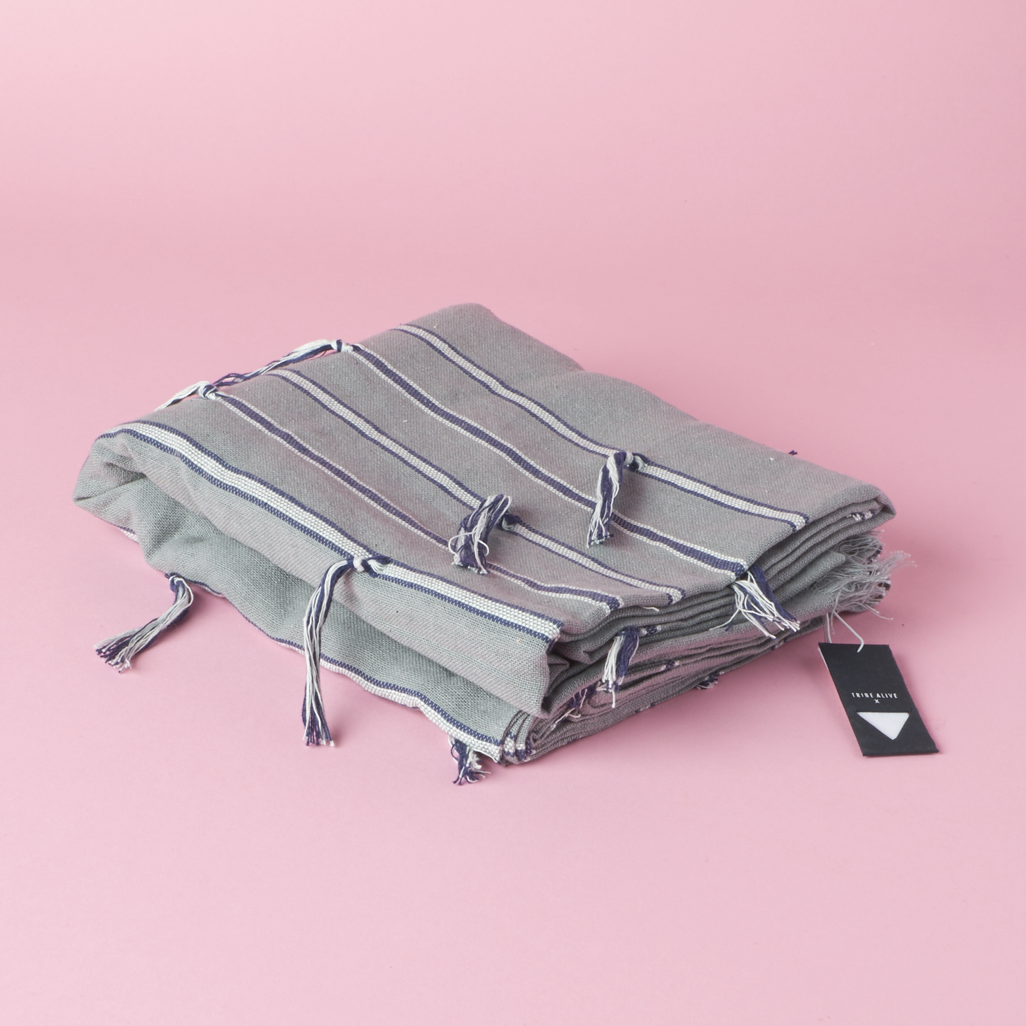 This handwoven scarf is made in India from 100% cotton. I love the muted grey and navy colors, and the tassels are a unique touch!