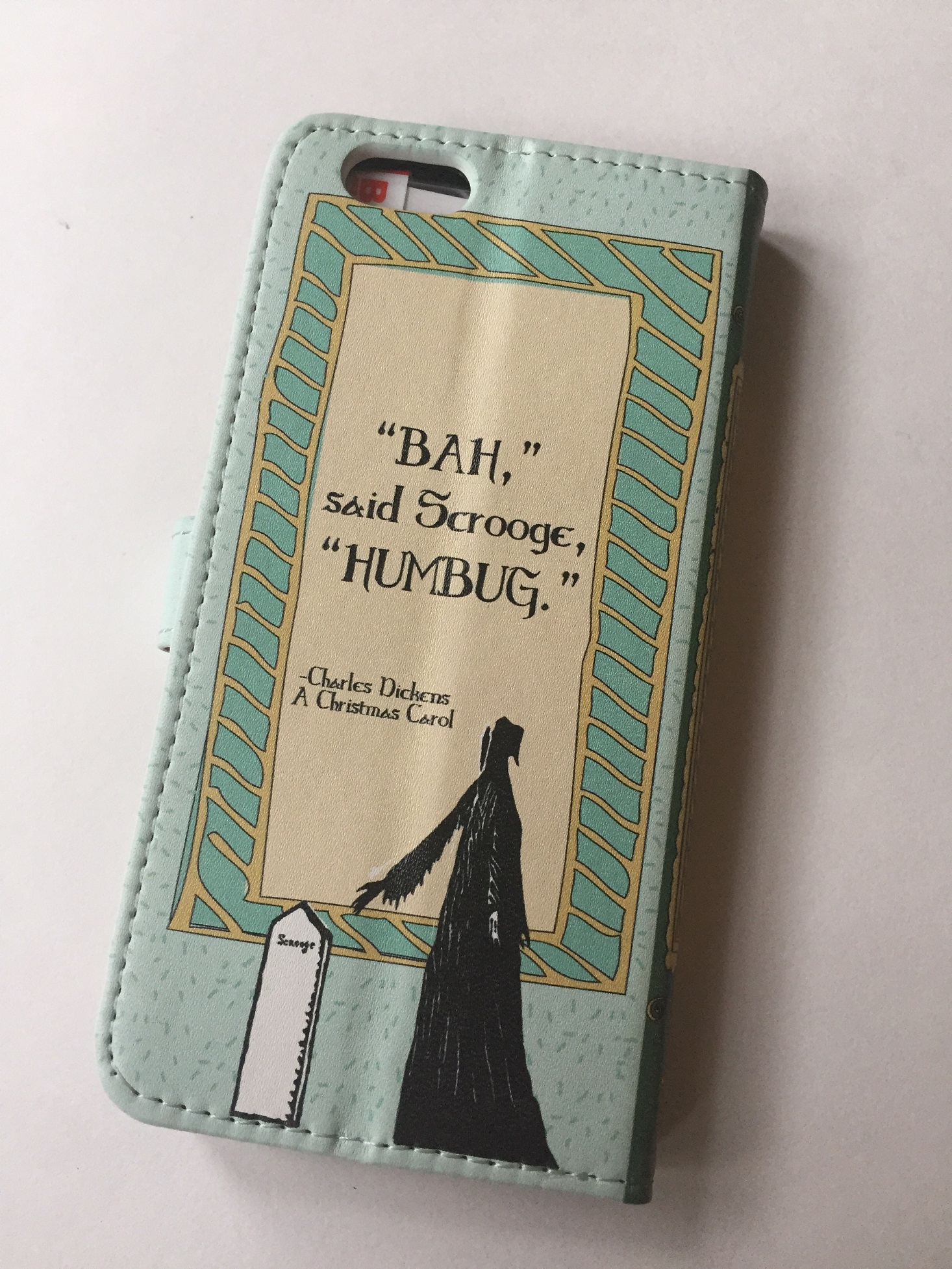 What a perfect selection for the month of December! I love the colors used, the wonderful font and most of all Scrooge’s mustache. The phone case is made from faux leather and is more like a phone wallet in that it opens with a magnetic snap closure and has slots for credit cards. The piece that fits around your phone is hard plastic and reminds me of my normal iPhone case.