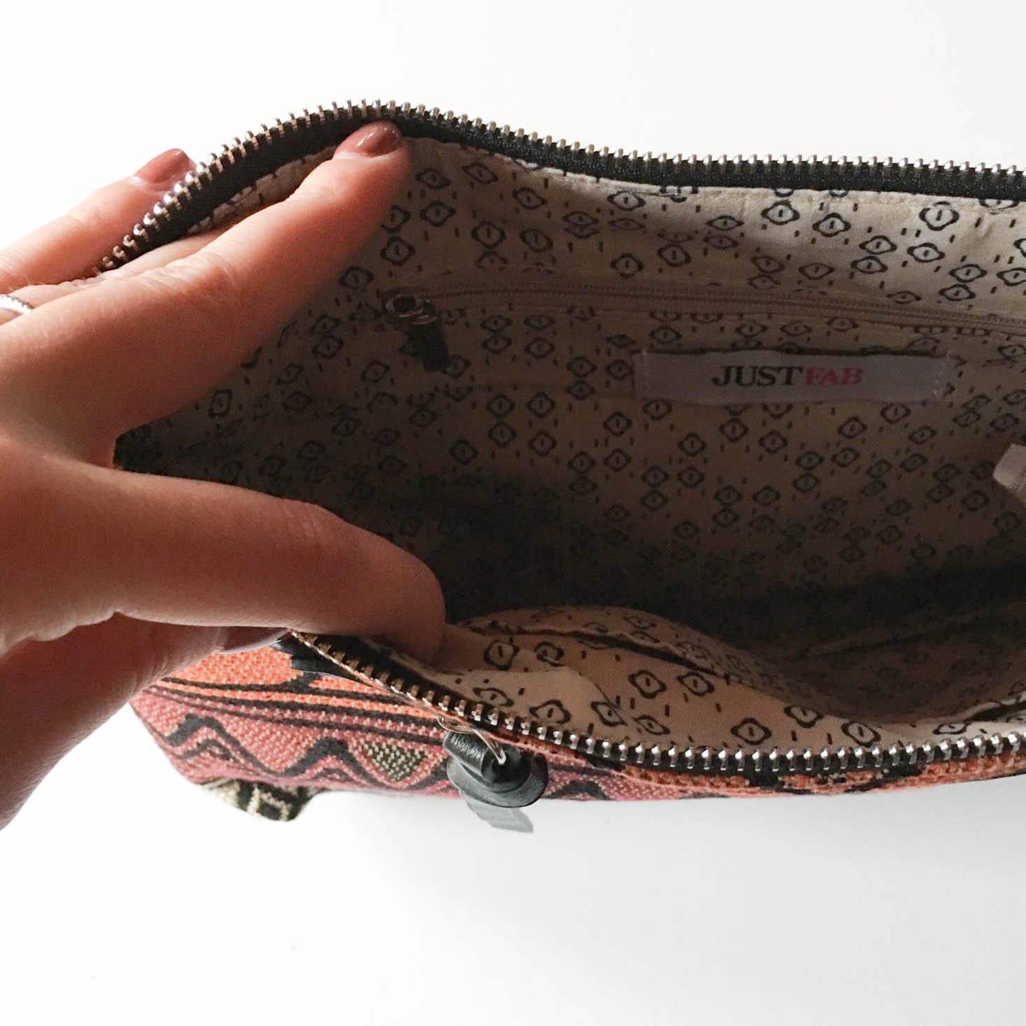 The inside of the bag has a complimentary patterned lining and two pockets, one of which is zippered. There is a plethora of room for everything from my wallet, keys and phone, to a small book or tablet.