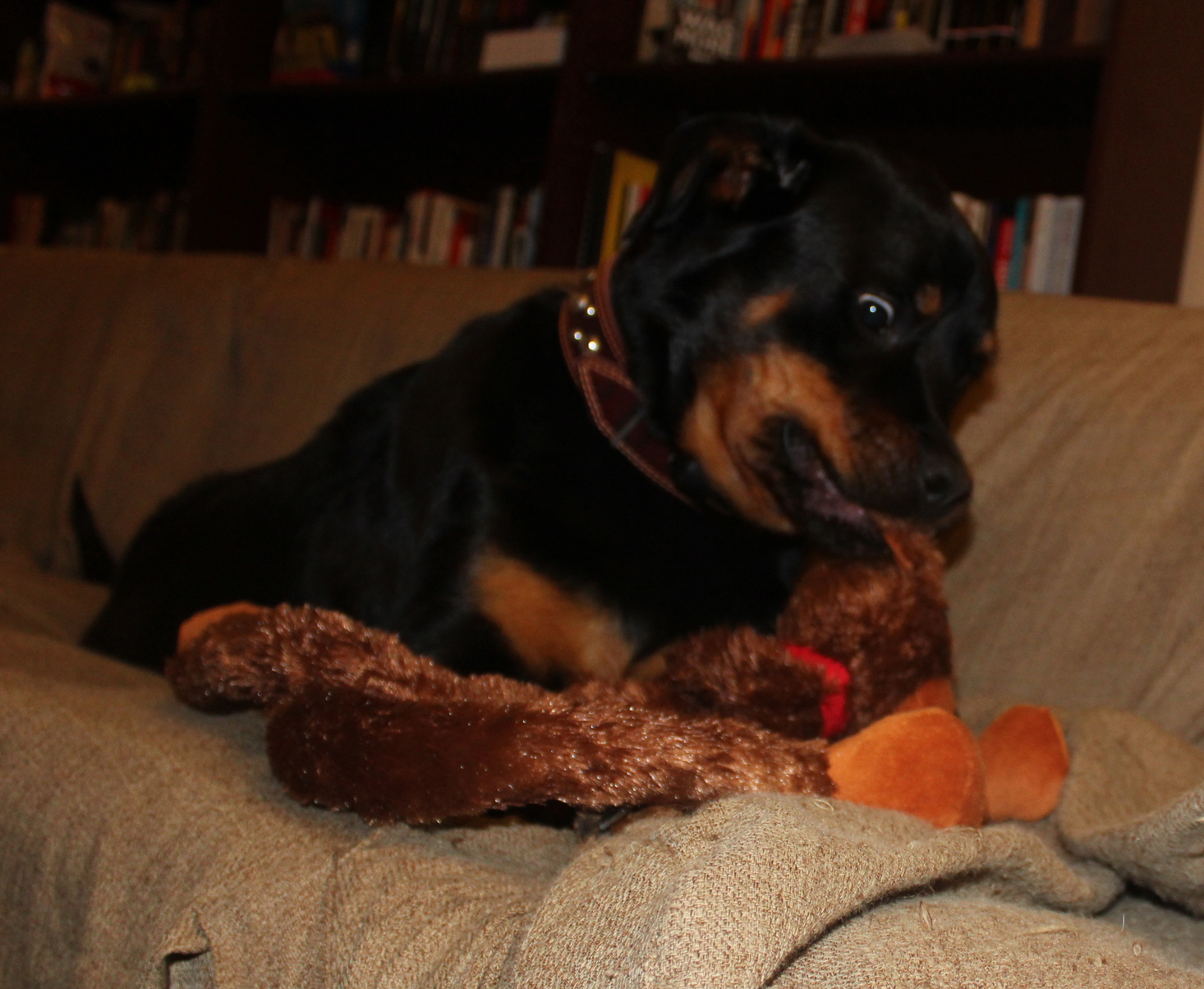 I can find a lot of toys from this brand online but I haven’t been able to locate this particular one. Most of these seem to be selling for around $10 so that’s where I’ll estimate the value. This didn’t last super long (a hole opened up on the side) but Nyx sure had fun destroying it. It is appropriately-sized for a large dog, but it should work for a 50 or 60-pound dog, as well. (We received this same toy in Pet Treater this month.)