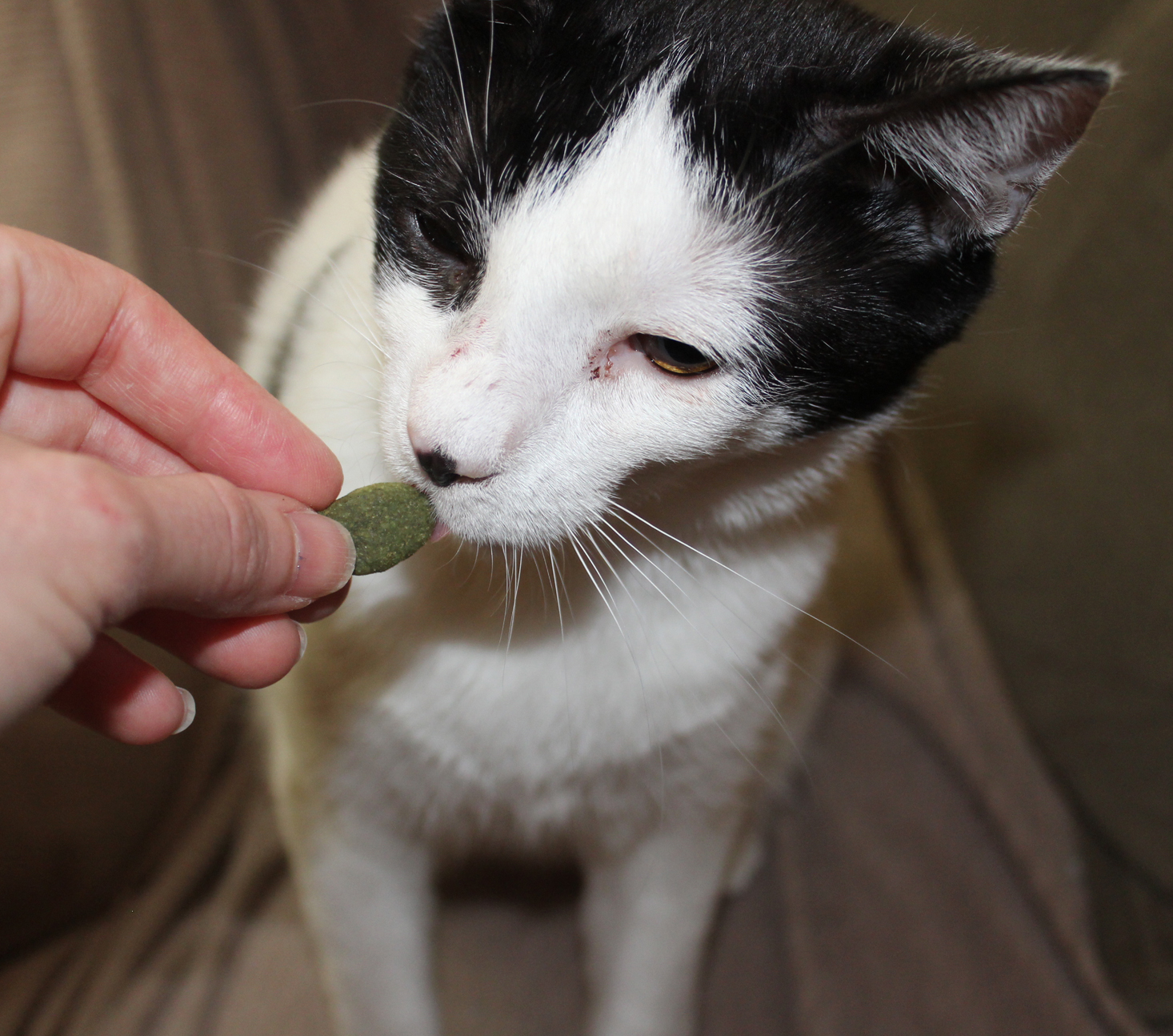 I have seen these branded as Smart n’ Tasty or Emerald Pet and they appear to be the same product (we’ve received both before, in other cat boxes, and the treats are identical), so I’ve linked to the Smart n’ Tasty ones as they were easier to find online. These are crunchy treats that are supposed to help keep your cats’ teeth clean. Sneaky and Madison like them and Angus did eventually eat one, but it took him FOREVER to finish it.