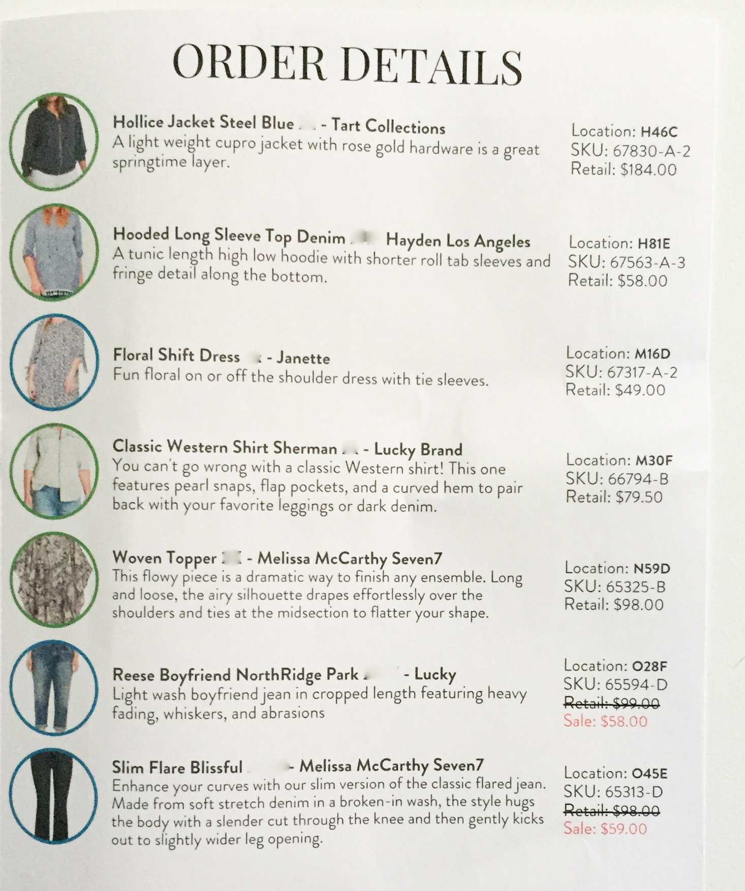 When I signed up for this service, I took a pretty lengthy quiz in which I indicated my price, size and style preferences. It looks like they have done away with listing your preferences on this sheet, but there is an area where they print any notes you have sent to your stylist for this shipment. The only thing printed here is my Pinterest style board, which is what I sometimes send if I am in a hurry and don't have time to write. In any case, I would expect what I receive to be reflective of my tastes, and for these boxes to vary quite a bit from subscriber to subscriber. There is also a note from my stylist, Emma. It explains why she chose the items she picked for me.