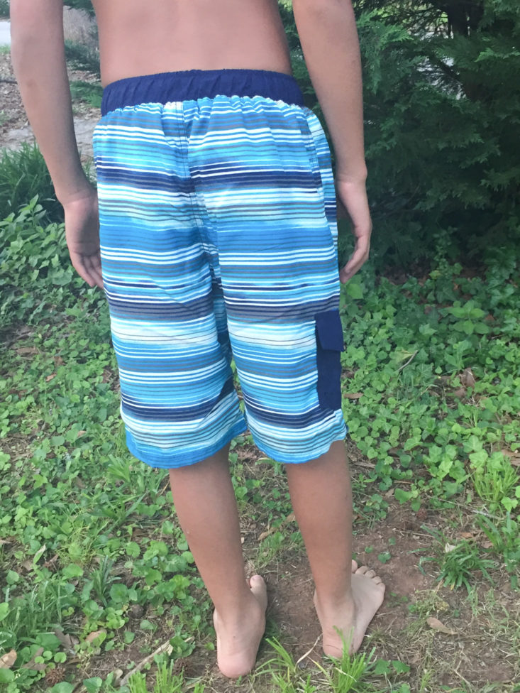 My 11-year-old is modeling the striped trunks in a size XL (12). He is average height and weight for his age, and again, these fit perfectly. He said they were super comfortable! I also didn't notice the pocket on the shark trunks, but I like the contrast pocket on these.