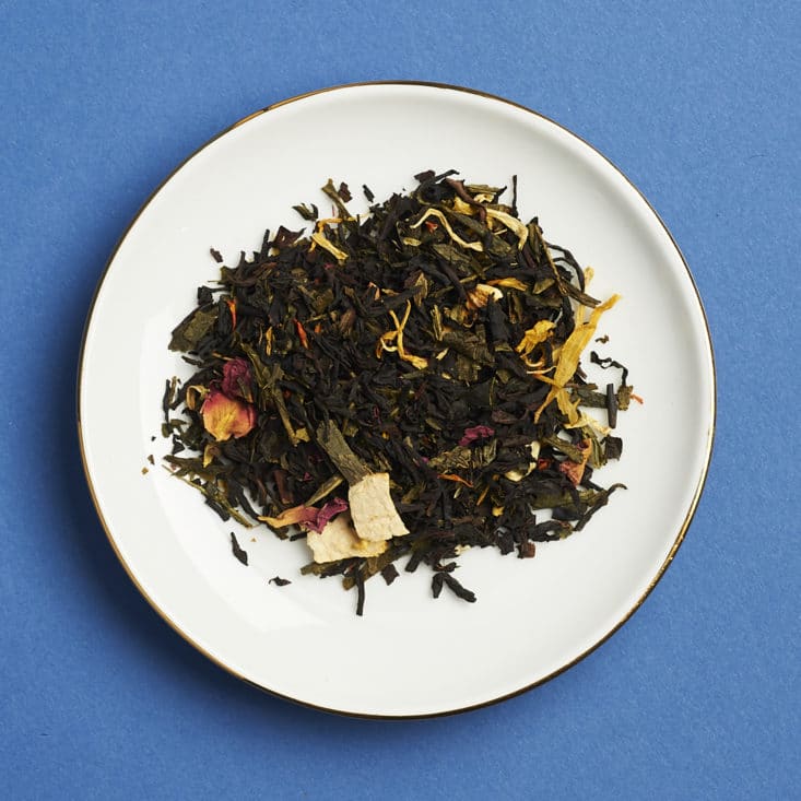 I think last month was the first time I had ever had a roasted green tea. I really enjoyed it, so I was excited to see this! Last month’s tea only had one ingredient—houjicha. That’s the main ingredient of this tea, but in addition to houjicha, we have almond pieces and calendula petals. This tea also has a fast brew time at 3 minutes and slightly different brewing instructions. The options are to brew at 175° or pour boiling water in a cup, wait 40 seconds, then add the tea. I went with the latter of the two options. The fragrance of this tea was really nice, and it really did smell like maple sugar on top of the roasted green tea. Like last month’s tea, this had a very woodsy flavor but with a maple aftertaste. This reminded me a lot of last month’s, but the sweet scent and flavor softened it a bit. Roasted green tea is really interesting and maybe a new favorite!