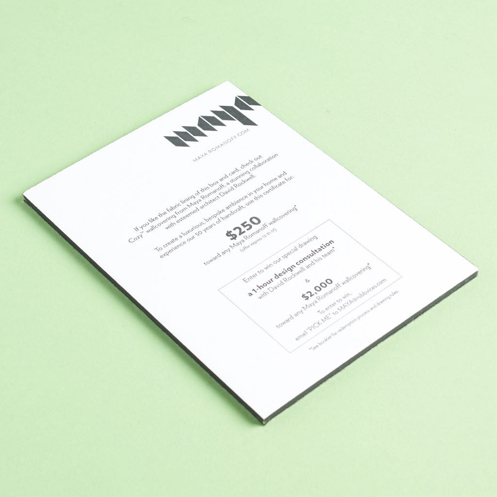 This box also included samples of fabric wall coverings from Maya Romanoff. (The other sample is the size of the box and pictured at the top of this review).