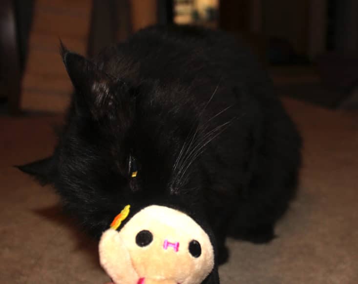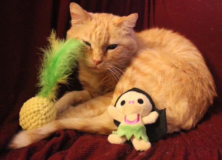 Since this is the Crazy Cat Lady version of the box, we also received some catnip toys. I like how the toys are exclusive and fit with the Hawaiian theme of the other items in the box. They are well made and Angus always enjoys them, as you can see below. (Sometimes the other cats are also interested, but my other four are all seniors and not as into toys as they used to be.)