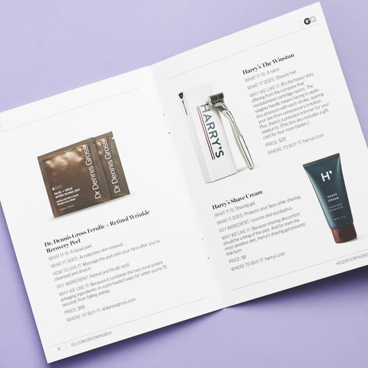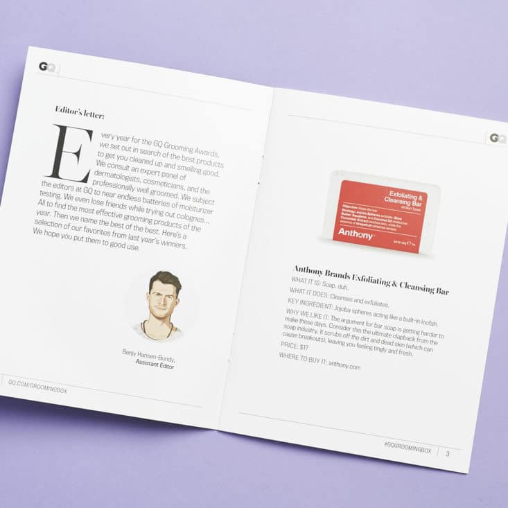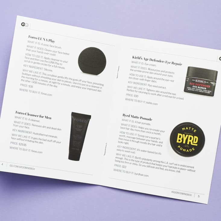 It includes a letter from a GQ assistant editor setting the tone for the box and values and information about each item in the box. Please note - the values listed here are for the full-size version of the product.