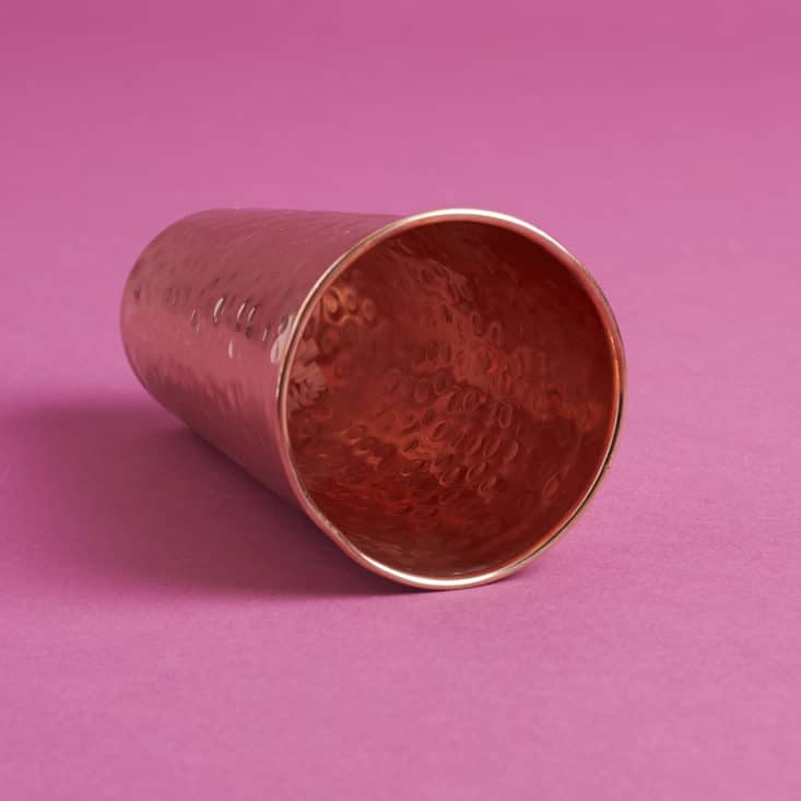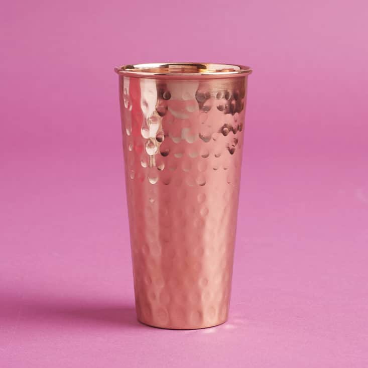 This cup is 5 inches tall, and 3 inches across. It's a quality piece (100% copper), and it has a good weight to it. I just wish they had included a set of two!