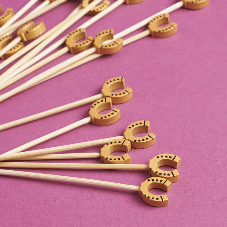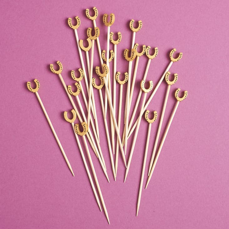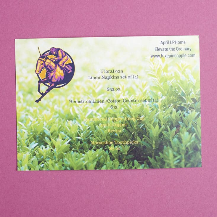 The box theme is inspired by the Kentucky Derby. On the flip side of the card are details for all the items included: