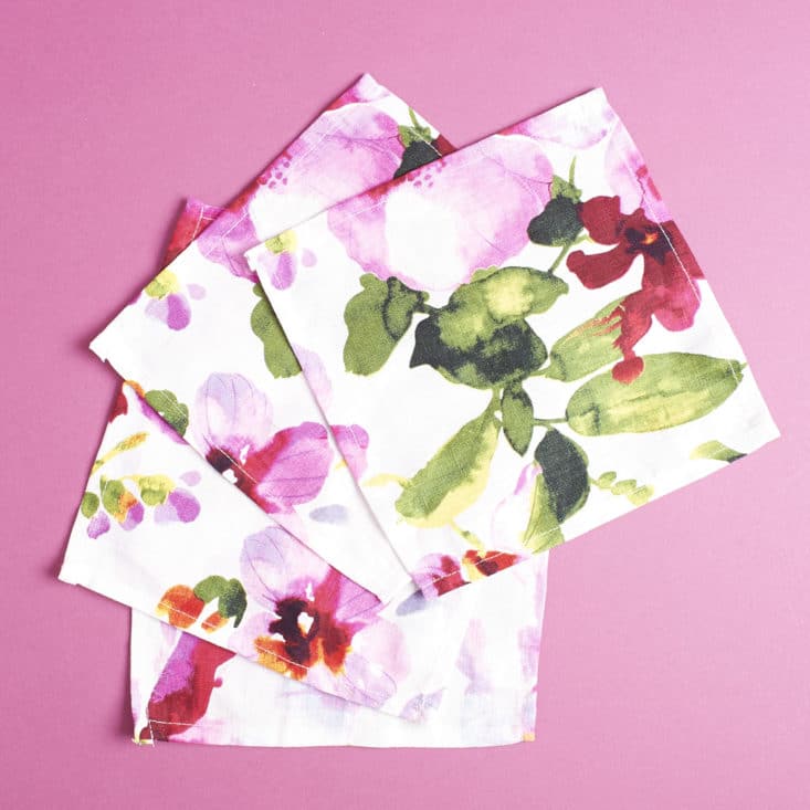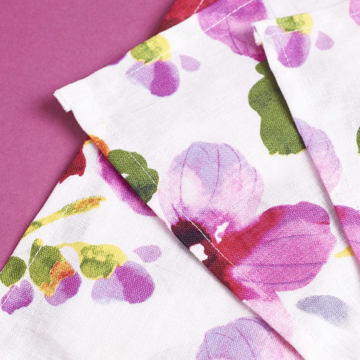 These napkins are 100% linen and measure 9 by 9 inches. They're beautiful, but don't really fit with my decor, so they will be gifted.