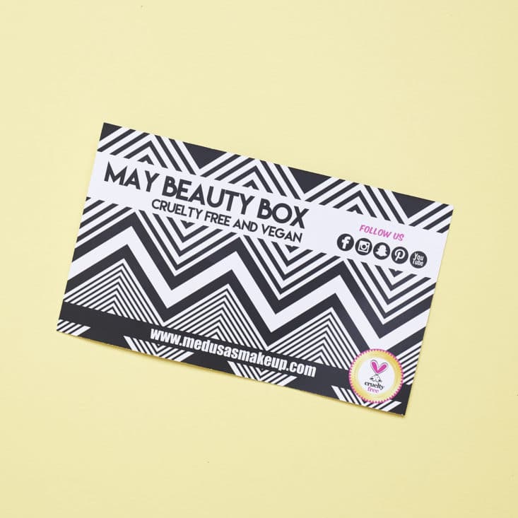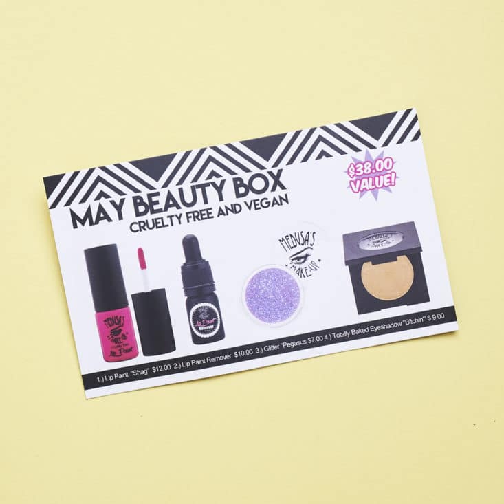 The Products: Each month you will receive 3-5 vegan products to try. The box is curated by Medusa's Make-Up team and has a value of $40.