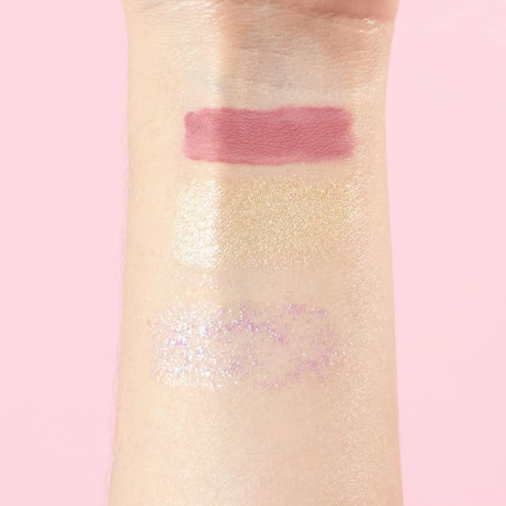 To really make it pop, I recommend using Glitter Glue to keep it in place and get a more intense application. Here it is swatched beneath the lip paint and the eye shadow: