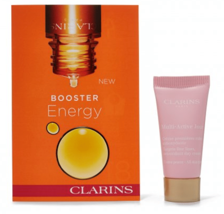 While supplies last, use coupon code SKINBOOST to get this free Clarins Multi-Active Day All Skin Types deluxe sample and Energy Booster packette when you purchase $25+ in the shop!