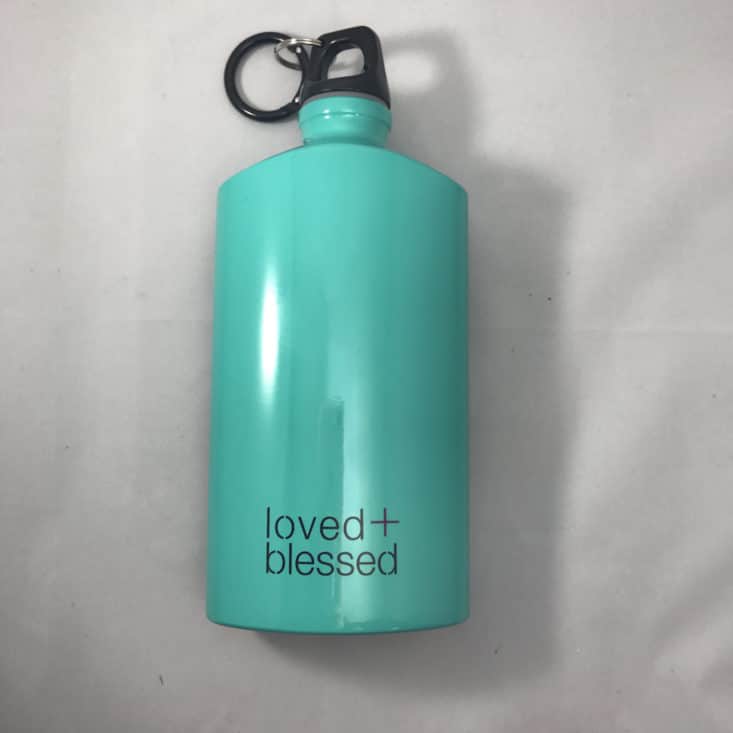 This aluminum water bottle has a carabiner-like clip to attach to a backpack or purse and it’s sturdy. The front of the water bottle says, “Refresh my Soul” and on the back says, “Love + Blessed”. A water bottle for when I”m thirsty, symbolizing how I need to thirst for Jesus. I admire how Loved + Blessed finds appropriate items to tie along with their monthly theme