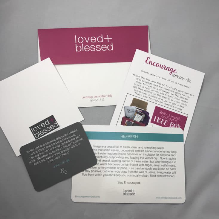 Loved + Blessed include an Encouragement Kit with every subscription box. I love the idea of an encouragement kit. It is meant to be passed on to a stranger or as an encouragement for someone I know. Loved + Blessed encourages a handwritten note on the blank card, include homemade cookies or a gift that relates to the theme, add the scripture card and “Refresh” card to the box to give to someone else.