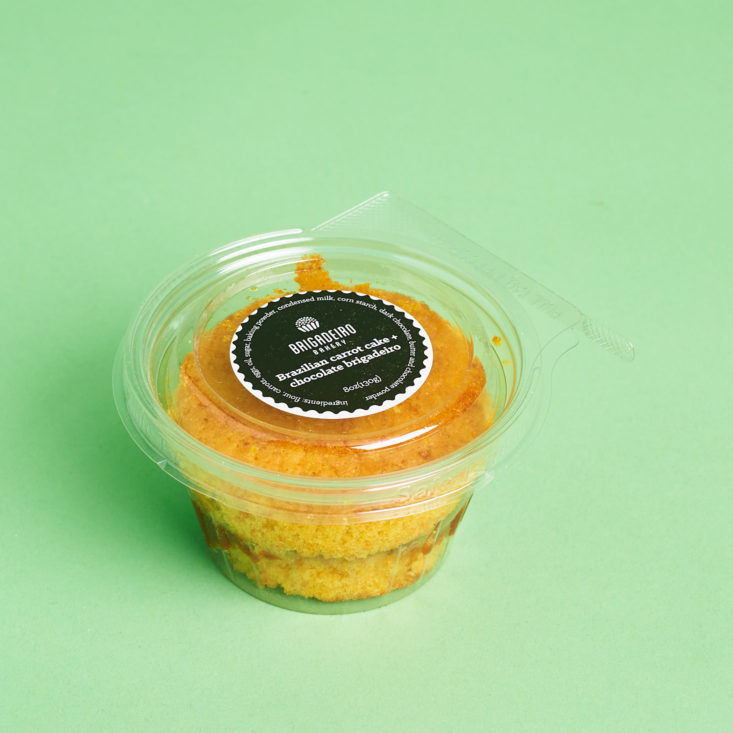 First, just to get it out of the way, the price I linked to above is for the most similar item I could find on the Brigadeiro Bakery online shop. Online, the cake-in-a-jar comes in a literal glass jar, whereas this comes in plastic. It also looks like the official version has frosting on the top, like a cupcake, whereas this item just has frosting in the center. But the two products seem to be about the same size and capture the same yummy recipe.