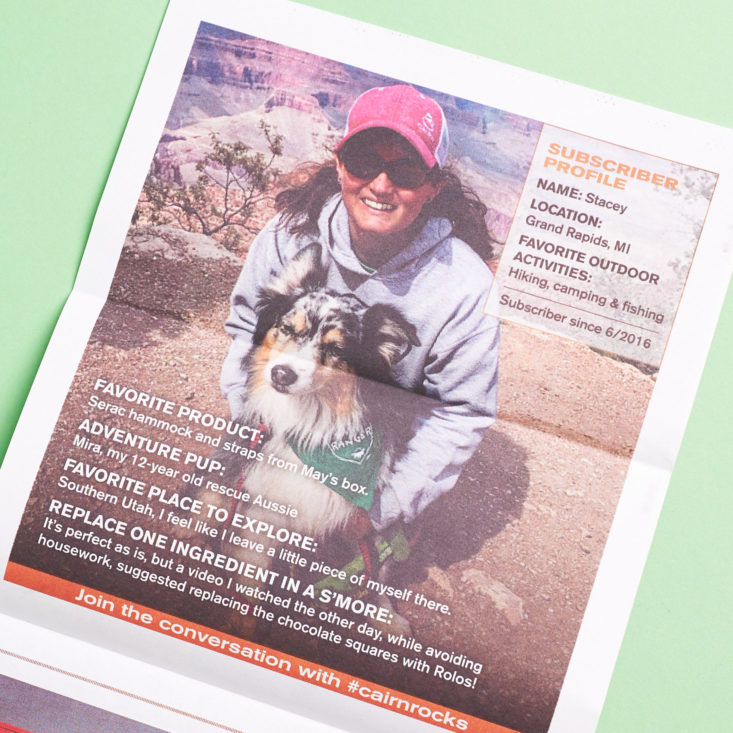 Cairn Scout! Featuring all the info we’re used to - full descriptions of each item, coupons from manufacturers, a look at the next Obsidian box, tips for using your new gear, and more. It looks like it’s printed on easily recyclable newsprint too.