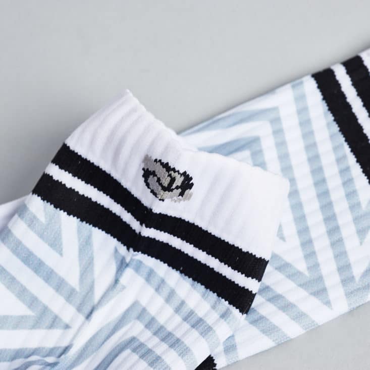 This month's socks feature a cool angular print in a silvery gray hue. It definitely is a print, too, so, unfortunately, it splits a bit as you stretch the fibers of the socks. The black stripes and details provide a nice contrast—these definitely feel like they'd pair well with a sleek pair of modern, minimalist sneakers. They're made mostly from nylon, with a pinch of cotton, elastic, and spandex. They're stiffer, though still soft, so they feel like they're really hugging your foot.