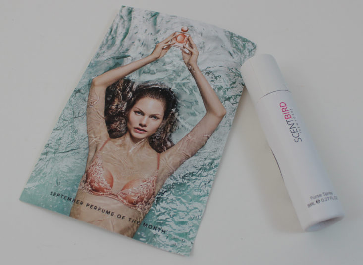 Scentbird always sends a preview card for next month’s fragrance. For September, it is La Perla from La Mia Perla. This one is intriguing, as I think jasmine and sandalwood go nicely together. (There’s no information card specific to your chosen fragrance since those will differ for everyone.)