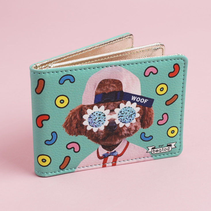 Hahaha this wallet is SO WEIRD. It's made of a faux leather material and has a dog on the front with flower sunglasses, a pink shirt, and a backward baseball cap that says "woof". Wat?