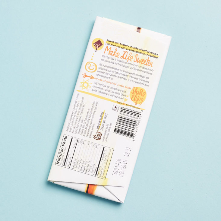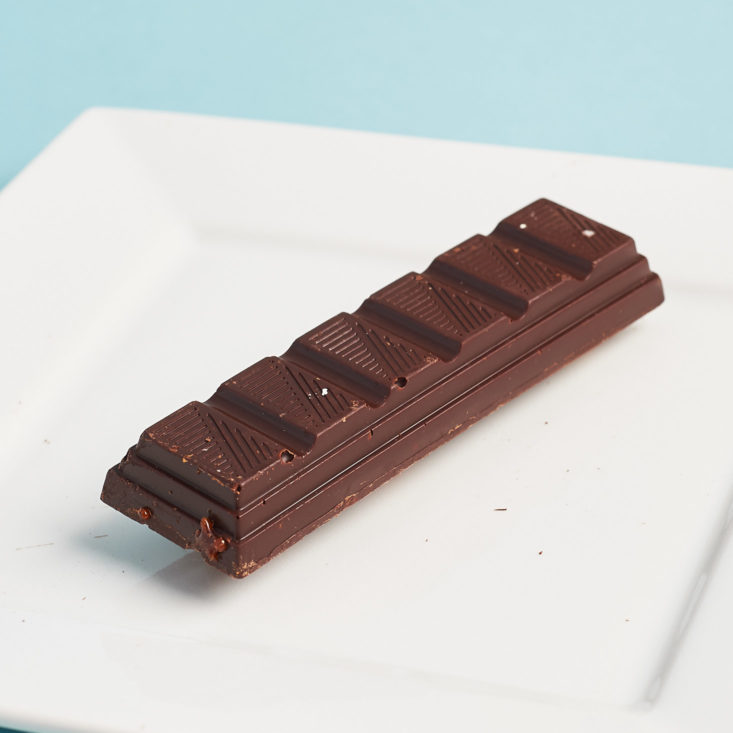 I'm not the biggest toffee fan, so this bar wasn't my fave. But I bet it'd go over quite well with toffee lovers! The chocolate squares are just thick enough to have a satisfying bite to them, and the chocolate has that earthy, almost fruity richness I like in darker varieties. The saltiness wasn't too overpowering here, in my opinion, so I could nibble at a few of these without feeling overwhelmed. (Though having a big glass of milk on hand is always recommended.)