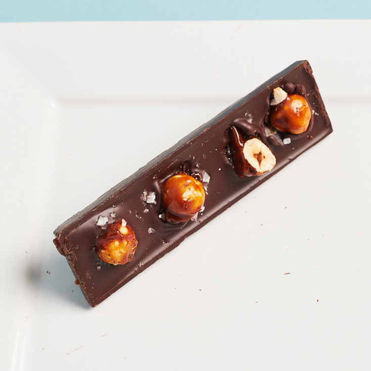 This bar packs so much flavor (sooooo much flavor) into each bite! In addition to the hazelnuts studding the back of this bar, there's also a fluffy kind of hazelnutty cream inside. The more I ate of this bar, the more flavors jumped out at me, from floral dark chocolate to bold, biting sea salt. The sweet and savory combination made me think there was caramel in this bar! All in all, it might've been a little overpowering for me, but it was an awesome chocolate experience!