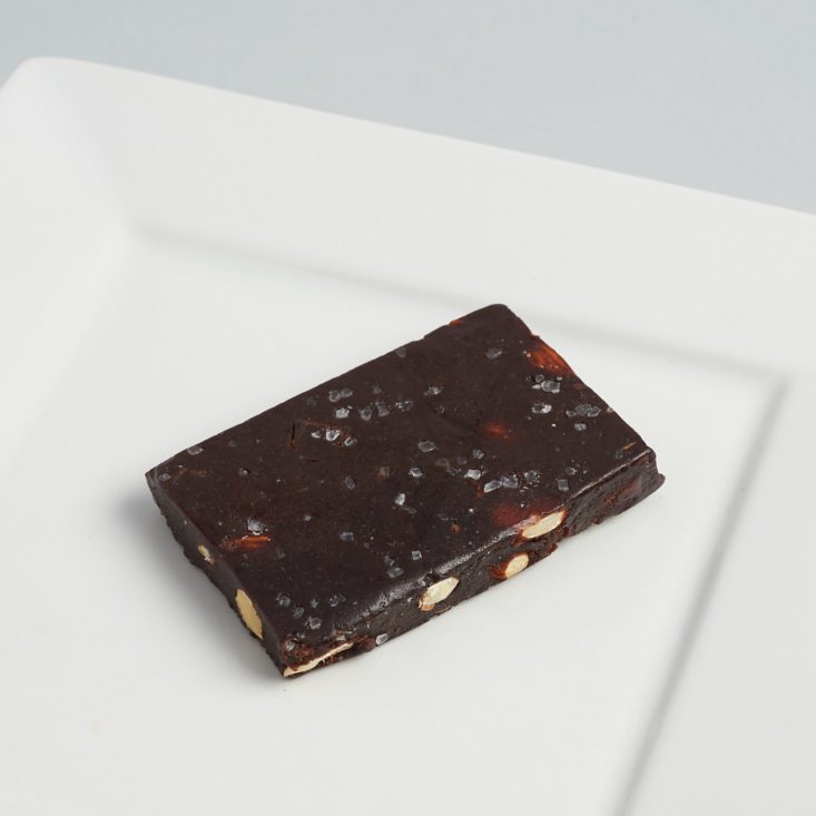 I loved this bar! I've hard RX Bars in the past, but never this flavor. The dark chocolate, pinch of salt, and chunks of almonds are the perfect bit of oomph this very chewy, somewhat sticky, extremely filling bar needs! It tastes every bit as satisfying as an after-lunch cookie, but with such simple ingredients, it's much easier on my body. Yum!