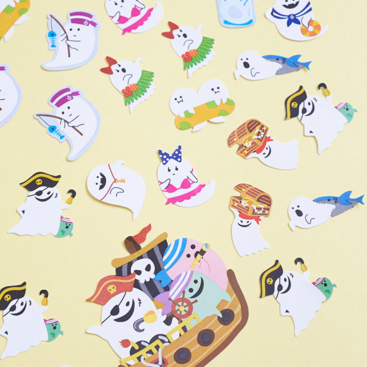 These ghosts have the same quirky spirit as the sticker sheet, except they've got a pirate theme goin' on! I love the little ghost fisherman who's caught a fish skeleton, haha! I do regret that I never know what to do with these little die cuts. For now, I've just been keeping them in a drawer and waiting for the perfect craft. My first thought is to scatter them over a party table like confetti. What's your favorite way to use 'em?