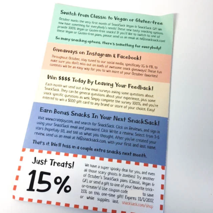 SnackSack includes a pamphlet that notes all of the products that are within the box, along with how to find them online.