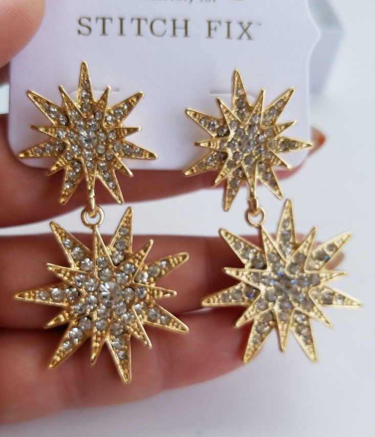 The problem with some holiday-themed accessories is that they are so obviously themed that they can’t be worn for other occasions. I love these earrings because they can be worn all year round. They actually remind me of Glitter and Gold Jem. They are truly, truly, truly outrageous! In addition, they have a mid-century modern aesthetic that appeals to me. These gorgeous crystal, gold plated costume earrings have posts and are not clip ons, which is a plus. They are a Stitch Fix exclusive design which is why I am deciding to keep them as well. At a mere $14 after styling fee, how could I resist their charms?