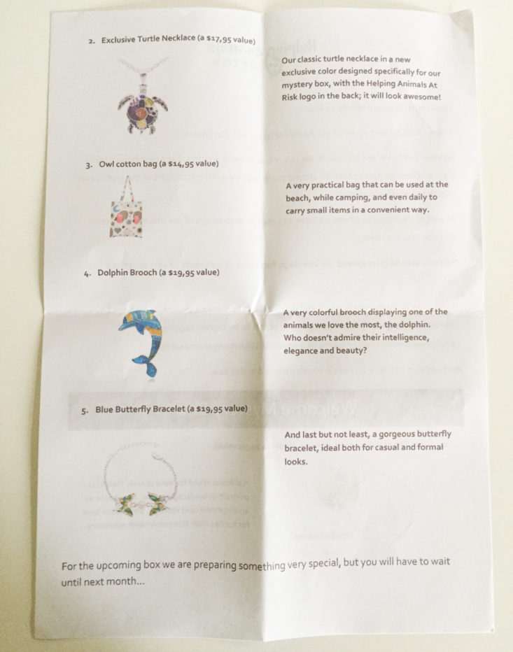 This review is of the Welcome Mystery Box. Usually, boxes are themed around one animal, but this seems to be a bit of a sampler. This is the letter that was included in my package, detailing the contents.