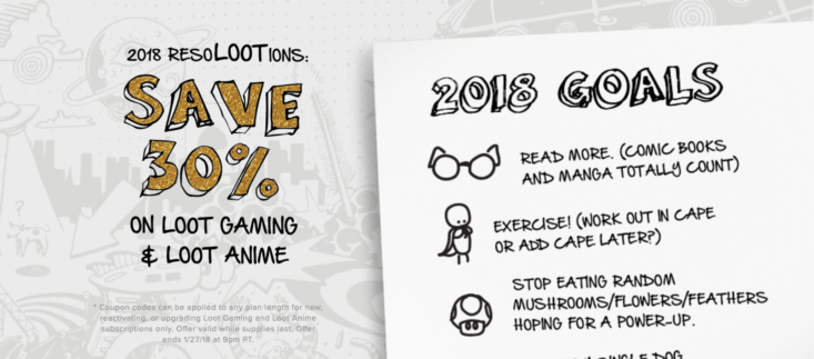 Full Details:*Coupon codes can be applied to any plan length for new, reactivating, or upgrading Loot Gaming and Loot Anime subscriptions only. Offer valid while supplies last. Offer ends 1/27/18 at 9pm PT.