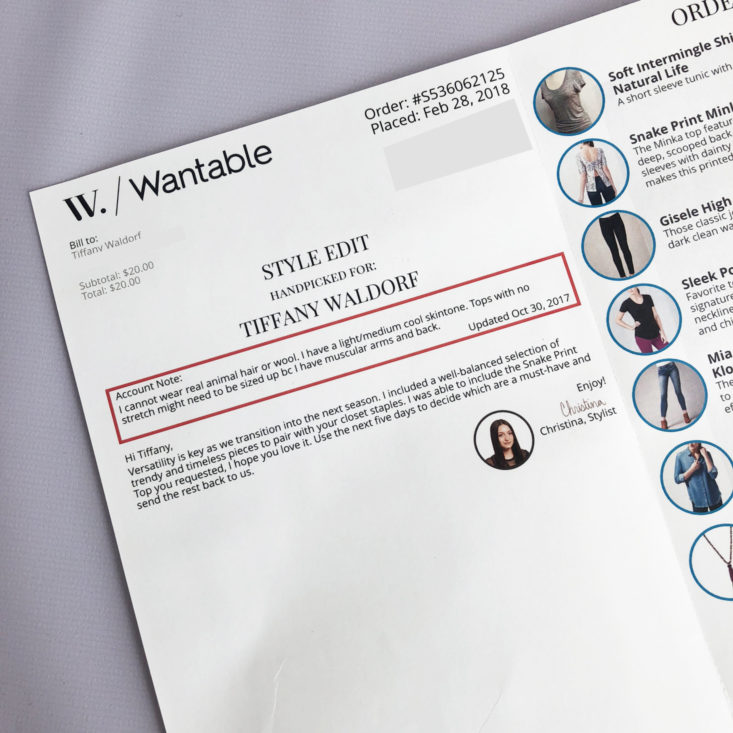 Each edit includes a booklet with a note from your stylist and an invoice. This month, my stylist Christina sent me 6 clothing items and 1 accessory.