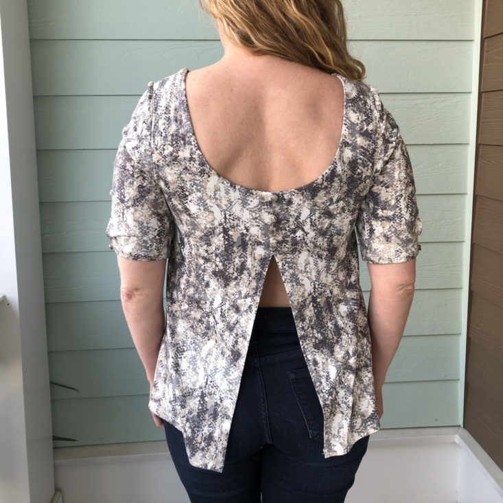 I requested this top in my Stream and I’m so glad that my stylist was able to include it. I think this is my favorite piece this month! I love the subtle pattern with greys, tans, and blushes and the button details on the sleeve and back are so cute. The fabric is smooth and stretchy and the top has a built-in shelf bra so I don't have to worry about bra straps showing. Isn’t the split back so cute?! I love that it’s a way to bring a little sass to a look without showing too much. I can always layer a cami underneath for times I don’t want to show my back.