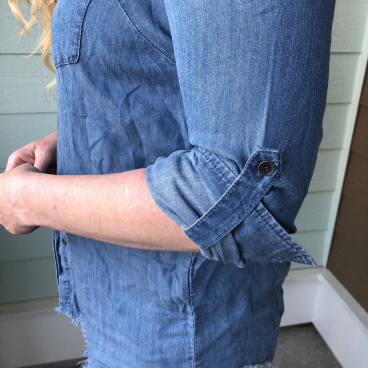 I love the cool, silky feel of this Tencel shirt. I like the raw hem here because it is symmetrical and the hidden button panel and roll-tab sleeves give a tailored feel to the top. Though there isn’t much stretch, the cut fits easily over my arms and shoulders with ample room to move around. I’ve tried it two ways for you in the photos: 1) Classic style with sleeve rolled and buttoned with the tabs 2) Tied up with the sleeves down. I’m really liking the tied up look with a pair of high-waisted jeans. I need to hit this top with my steamer to release some of the wrinkles, but I like that it doesn’t need to be perfectly smooth.