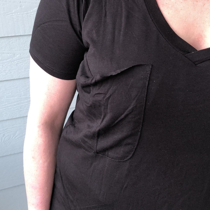Last month, I received this shirt in grey washed cotton and felt that the pocket was too droopy looking. This pocket has the same cut but, since the shirt is black, it doesn’t stand out as much. This one is also a rayon/spandex mix so it’s slinky and smooth. The cut is great because it swings away at the waist and plays down any thickness there. I think the curved hem is flattering and makes it a touch longer in the front and back so I could get away with wearing this with leggings. It has a bit more polish to it than last month’s and is a perfect layering tee for spring.