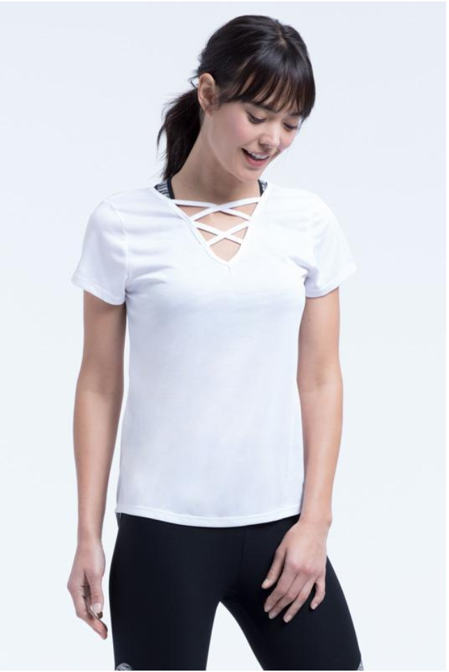 Maximize your performance style in our versatile short sleeve Empower tee, designed with a deep v-neck back to keep you cool while front strappy details add a fashionable touch.