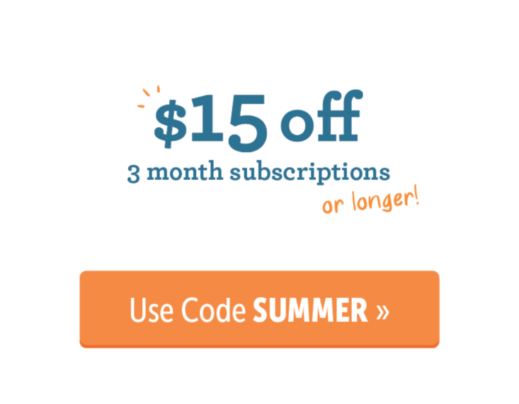 Full details: Save $15 is valid for 3 month, 6 month or 12 month subscriptions, does not include Deluxe add-on, shipping and is not valid in Store or on prior purchases. Valid through June 8, 2018 11:59PM PST or while supplies last.