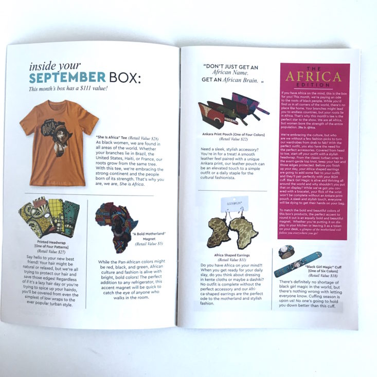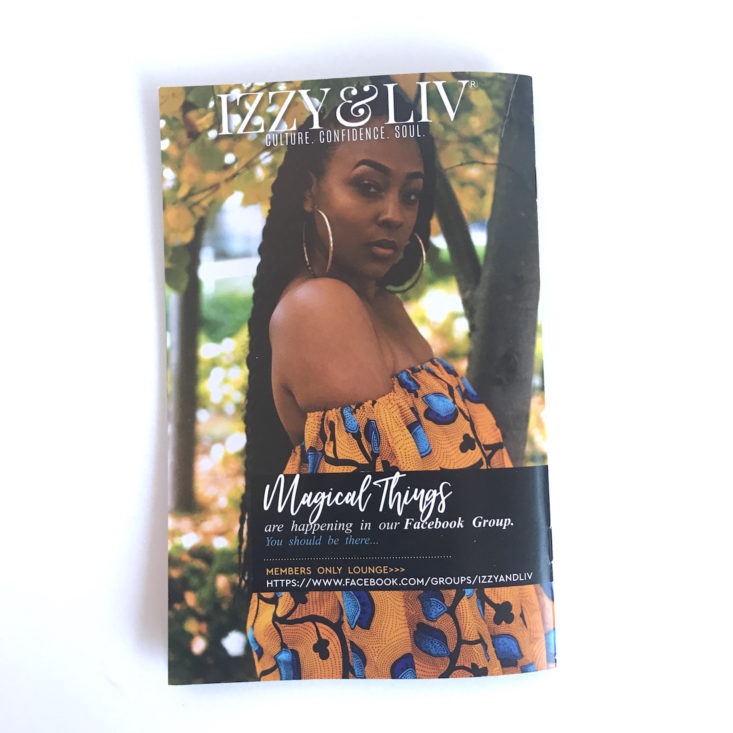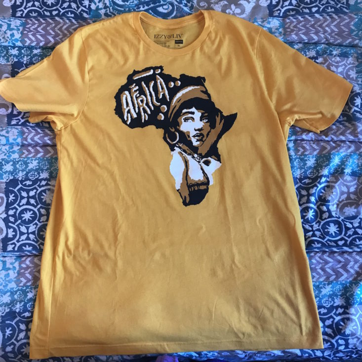Izzy & Liv t-shirts are a staple in their boxes, and their tees always reflect their theme. This month’s tee is gold, 100% ringspun cotton with the shape of Africa printed on the front with the word Africa on top and a woman’s face below it. I always look forward to their tees and wear them often. Their tees from previous boxes can be found here for purchase.