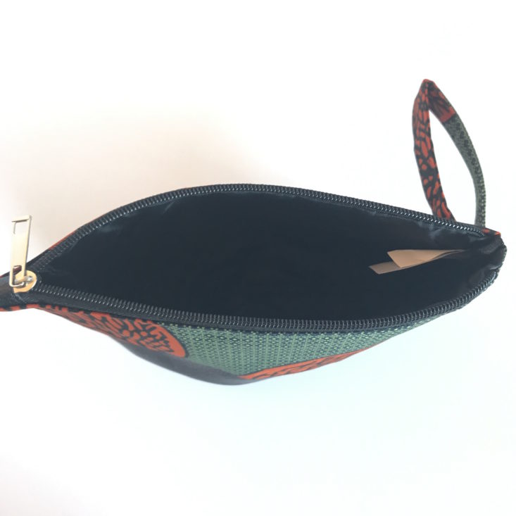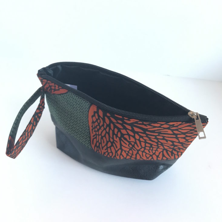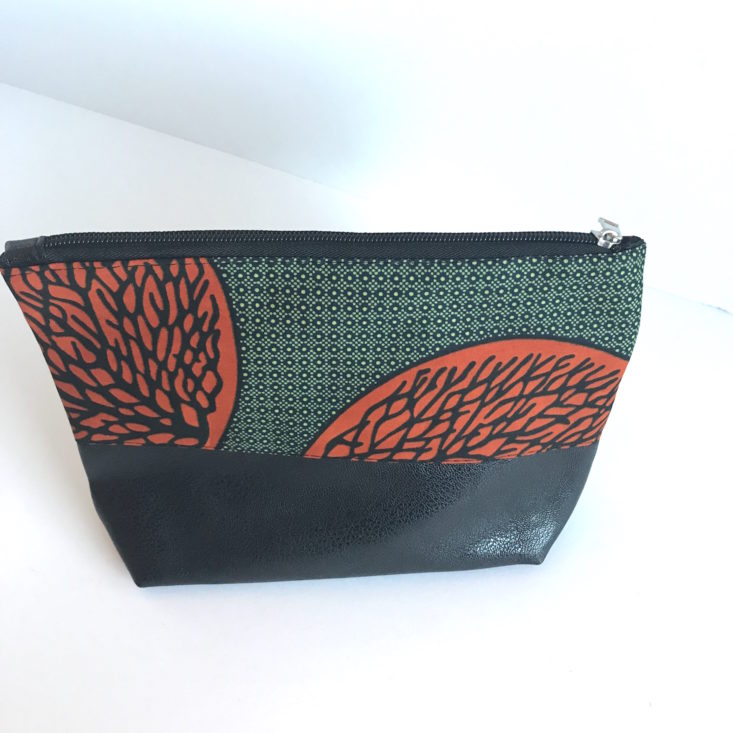 This small pouch with a strap handle has an Ankara print, and the bottom is leather as indicated in the info booklet. The pouch can fit my iPhone, change purse, a few makeup essentials, a small notepad, and a pen. Subscribers will receive one of the four designs.