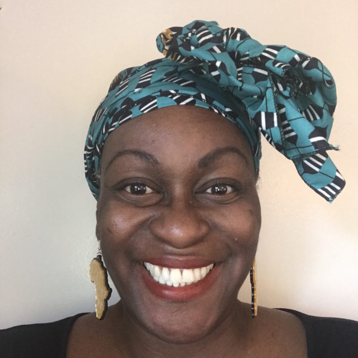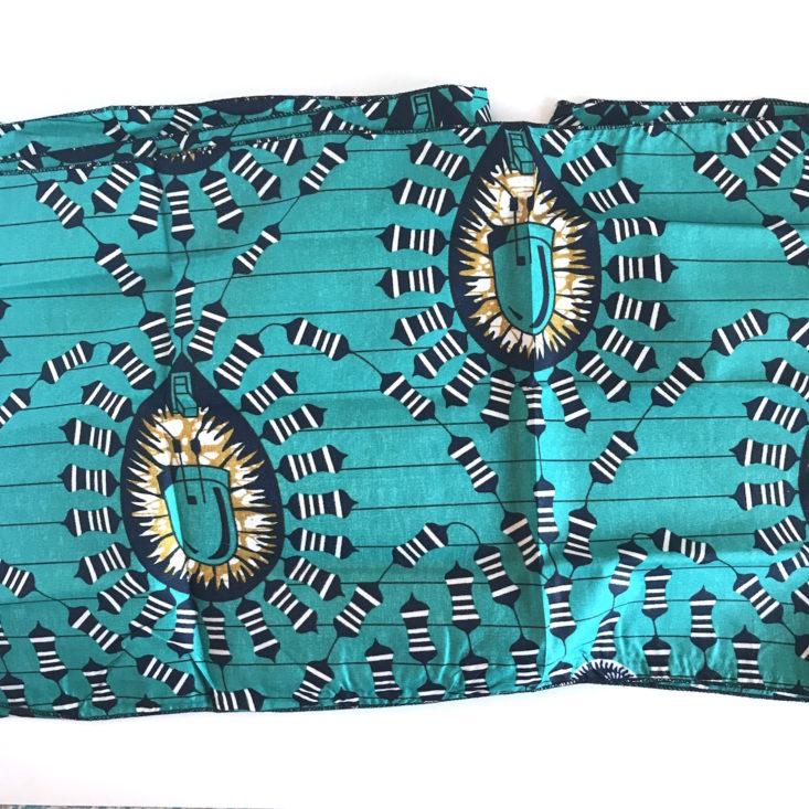 I received a printed headwrap in teal; subscribers will receive this pattern or three other patterns. The headwrap is large enough to style a variety of ways. I am the worst when it comes to headwraps. My attempt to style the headwrap, pictured at the end of the review.