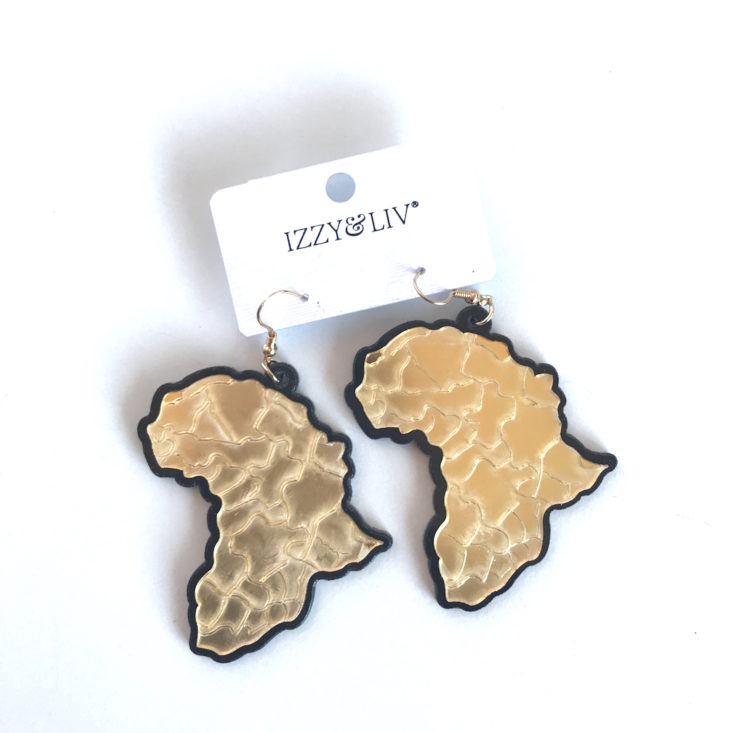 Continuing with the theme, I received a pair of Africa shaped earrings in gold and black. When I first saw the earings, they appeared to be cheap looking, but once on, they looked better. I’m wearing the earrings below.
