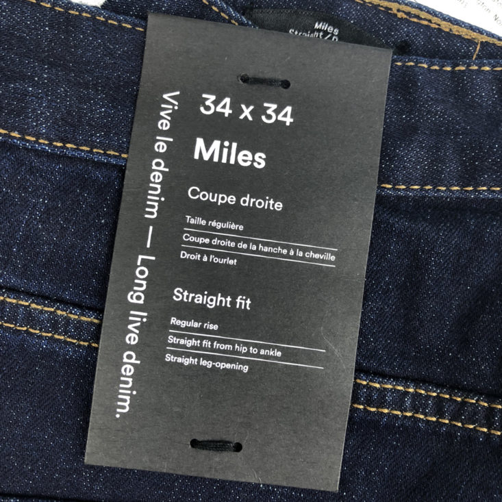 Like all of the pants John has received from Frank & Oak, these are very long. They only offer a 34 length with the 34 waist size and he really could use a 30 in length. He really likes these, so he doesn’t mind getting them hemmed to his exact length. They have a little stretch because of the 1% spandex/99% cotton mix which makes them very comfortable. The solid, dark blue wash looks sleek and can be dressed up or down. I think the price is fair for high-quality, sustainable denim too!