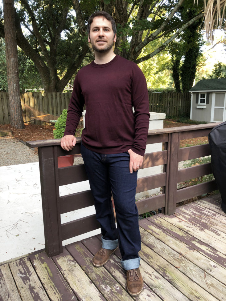 This is the same sweater as the red one, but with an abstract floral pattern. John really didn’t connect with anything else in his selections (besides the red sweater and jeans) but still wanted to order 3 items. The colors are really nice but the pattern is a bit too big and busy for John’s taste. I give him credit for trying something new though. He ended up returning this for free within his 10-day try on period and receiving a refund. The account interface is really user-friendly and made it super simple to request a return label and track the return.
